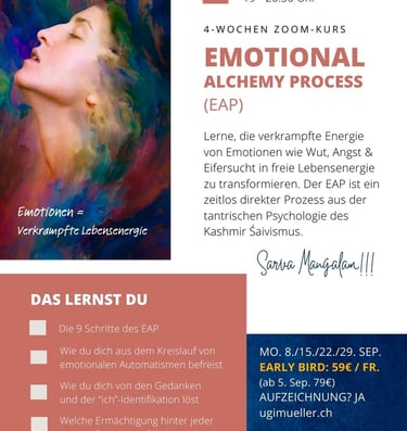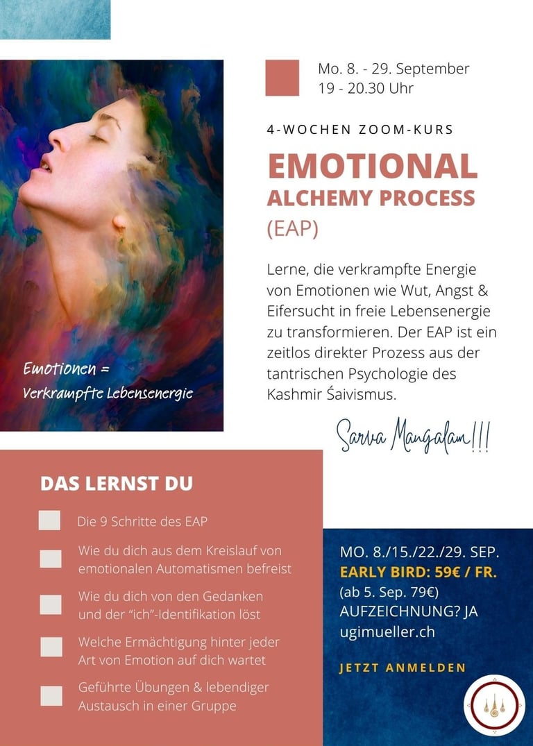 Lerne, die verkrampfte Energie von Emotionen wie Wut, Angst & Eifersucht in freie Lebensenergie zu transformieren. Der EAP ist ein zeitlos direkter Prozess aus der tantrischen Psychologie des Kashmir Śaivismus.